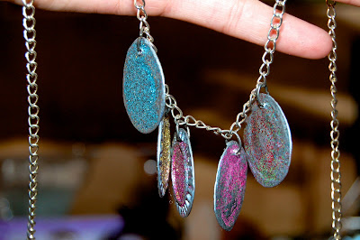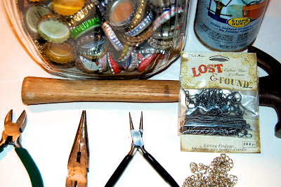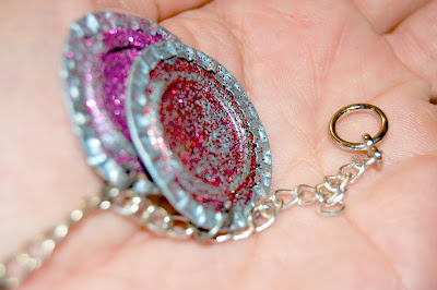 Get your chain out now. Once you open your findings you will use one and put it through your hole on the bottle cap. Next you will put it through one of the chain links and then close it. By doing this you are attaching it securely so it will not fall off.