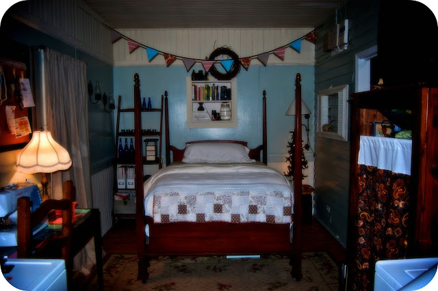 The picture on the bottom left is just a corner in the room, which I love. The picture on the right is my ceiling. How cool. A wood plank ceiling. <3