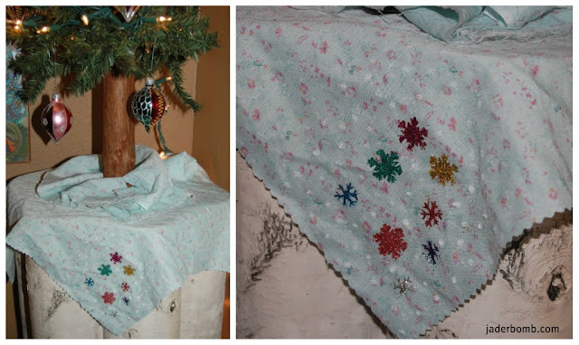 This is not our “big” christmas tree but just a baby one for decoration. I used this as a “Tree Skirt” for my baby tree. I think it came out just the way I wanted it too. I didn’t want to add too many snowflakes so it could look simple. I think I accomplished that. Whatcha think.